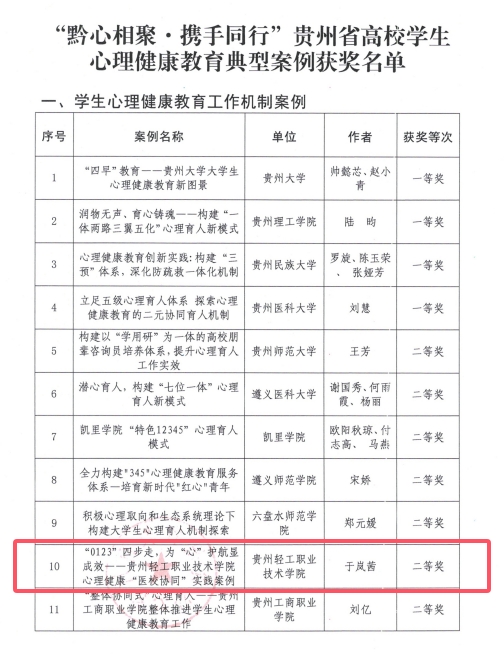 贵州省教育厅公布“黔心相聚·携手同行”贵州省高校学生心理健康教育典型案例征集评选活动获奖名单,我院党委学生工作部心理健康教育科于岚茜老师撰写的《“0123”四步走,为“心”护航显成效——免费不收费看污在线观看-免费看污污-免费看污污污视频软件心理健康“医校协同”实践案例》荣获学生心理健康教育工作机制案例二等奖;建筑工程系彭旺老师撰写的《演绎校园身边事,助力学子心成长——心理情景剧在高职院校心理健康教育中育人实效的案例研究》荣获学生心理健康教育特色活动实践案例三等奖。
