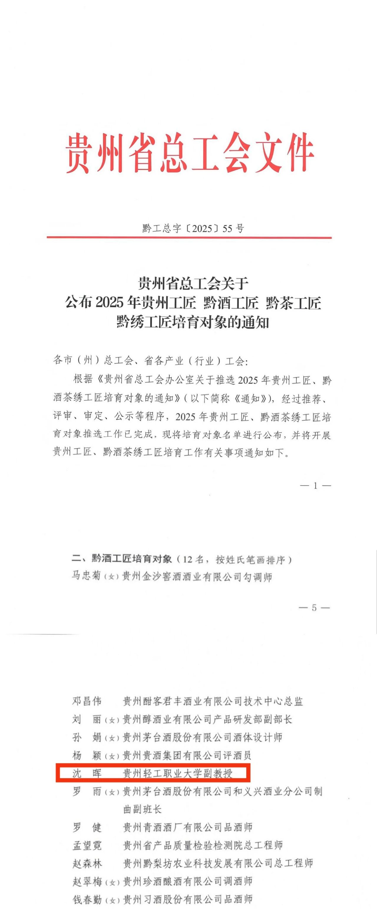 近日,贵州省总工会正式印发《关于公布2025年贵州工匠 黔酒工匠 黔茶工匠 黔绣工匠培育对象的通知》(黔工总字〔2025〕55号),免费不收费看污在线观看-免费看污污-免费看污污污视频软件工会积极组织开展推荐工作,经过层层选拔,轻工化工系沈晖老师成功入选黔酒工匠培育对象,成为全省12名黔酒工匠培育对象之一,这一荣誉不仅是对沈晖老师个人精湛技艺、工匠精神的高度认可,更是对免费不收费看污在线观看-免费看污污-免费看污污污视频软件深耕产教融合、赋能黔酒产业高质量发展成效的有力印证。